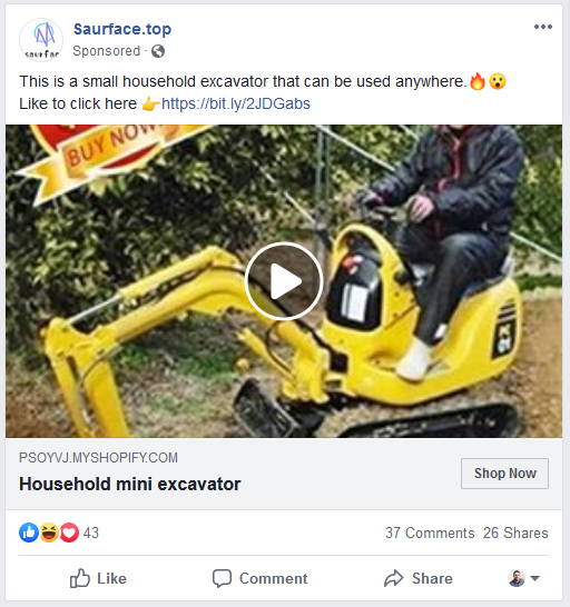 Watch out for ad scams on Facebook. For instance back on November 3rd I noticed ads for the same mini excavator from different “companies” at the same price of $179.00.